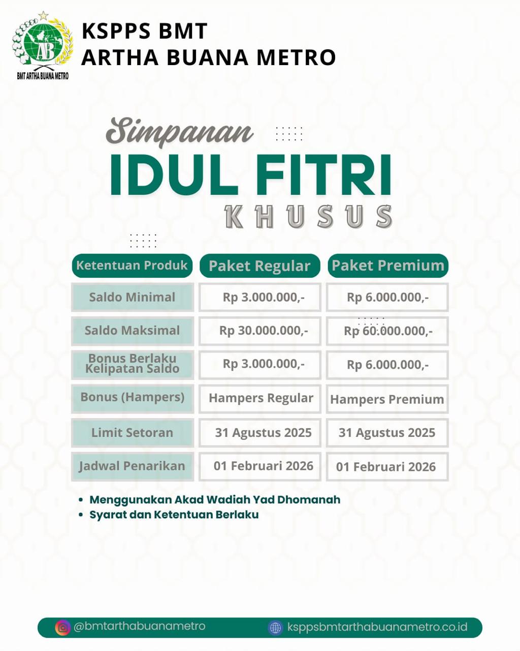Simpanan Idul Fitri Khusus adalah Simpanan untuk membantu persiapan keperluan Hari Raya Idul Fitri. Simpanan Idul Fitri Khusus menggunakan prinsip syariah Wadiah yad Dhamanah dimana penarikannya hanya dapat dilakukan pada waktu yang telah ditetapkan. Dengan ketentuan anggota tidak memperoleh bagi hasil setiap bulannya, tetapi berhak mendapatkan bonus paketan yang ditentukan oleh pihak KSPPS BMT Artha Buana Metro dengan syarat dan ketentuan yang berlaku.
